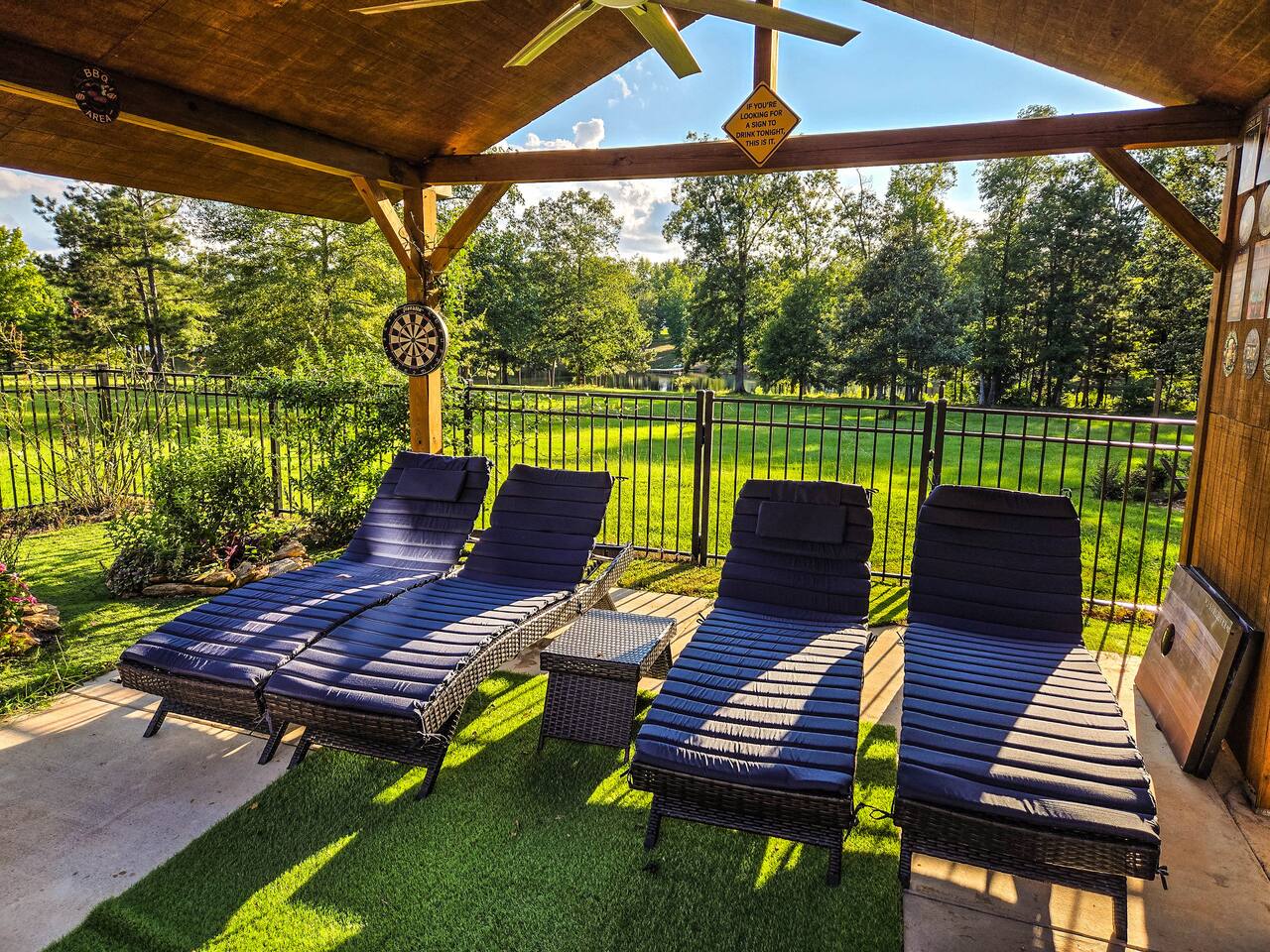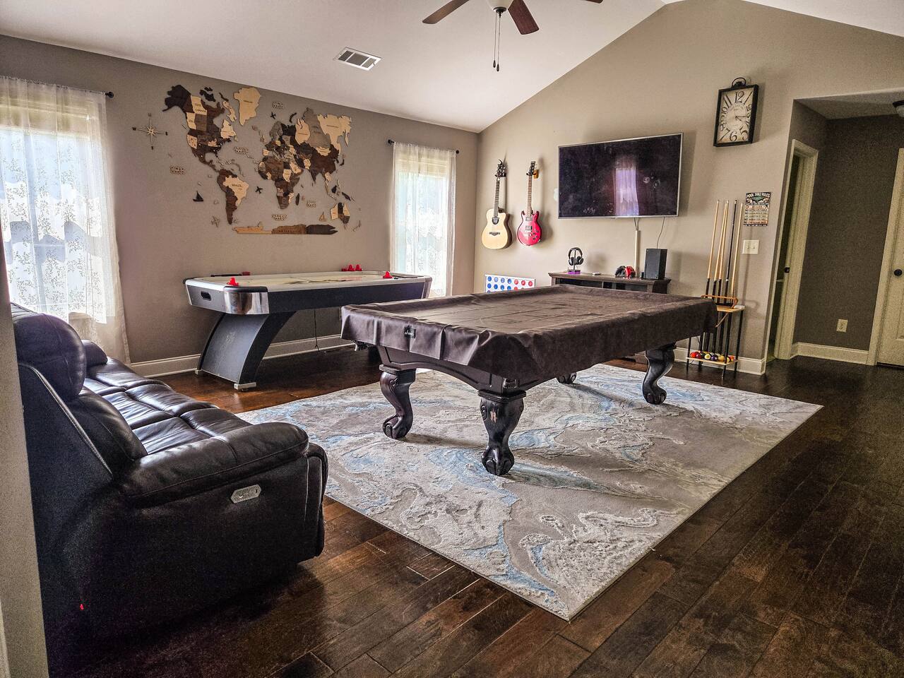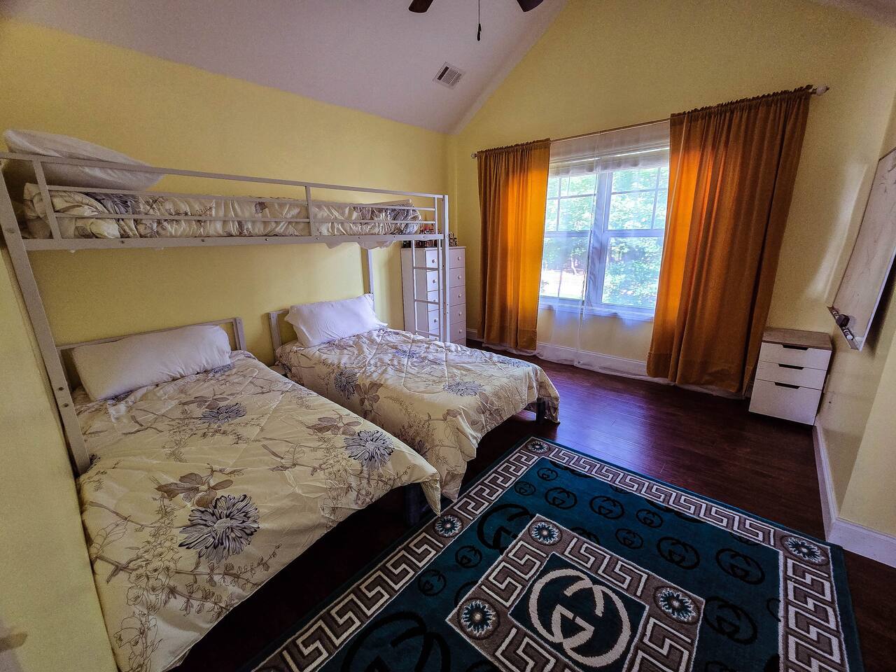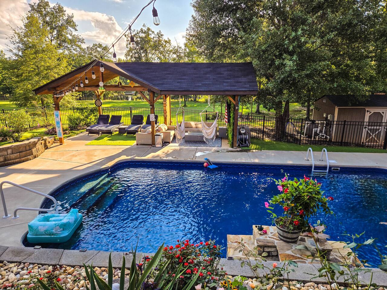 Stylish 6-Bedroom Lakefront Getaway | Pool • Game Room • Private Pier Welcome to your private retreat, ideal for families, groups, and individuals seeking to relax, recharge, and reconnect. This spacious home offers direct lake access with its own private pier, making it ideal for enjoying morning coffee by the water, fishing, or launching a kayak. Inside, you’ll find over 3400 square feet of well-designed living space with multiple gathering areas, a game lounge with a pool table, air hockey, and an Xbox, and a comfortable open-concept layout that brings everyone together. Step outside to a resort-style backyard complete with a swimming pool, a covered back porch featuring a grill, fireplace, fire pit table, and TV, and a luxury gazebo boasting a propane fire pit, oversized seating, and an outdoor TV. Whether you’re enjoying lake views, dining under the stars, or playing games with the family, this home is built for unforgettable memories. The space: - 6 spacious bedrooms, three full bathrooms, one half bathroom ** Main-level Main Suite with private bath stocked with shampoo, conditioner, and body wash - 5 upstairs bedrooms: ** 3 rooms with Queen beds ** 1 room with a King bed ** 1 room with a triple Twin bunk (perfect for kids) - 2 full bathrooms upstairs stocked with shampoo, conditioner, and body wash - Fully equipped kitchen with open flow to dining & living areas - Second-floor: ** Game lounge with pool table, air hockey, and Xbox Private backyard with: - Firepit with bench swing and wooden chairs - Seasonal swimming pool - Covered back porch with a grill, fireplace, and a TV - Patio table with propane firepit. - Large gazebo with propane firepit, swings, four lounge pool benches, couches, and a TV - Private lake entrance with private pier For your safety and the security of the property, outdoor security cameras are in place. These are actively recording and located: ** In the backyard, covering the pool and gazebo area ** In the front yard, monitoring the driveway and entry ** On both sides of the home for full exterior coverage - There are no cameras inside the home or in any private spaces. Driveway parking for 5–6 vehicles
